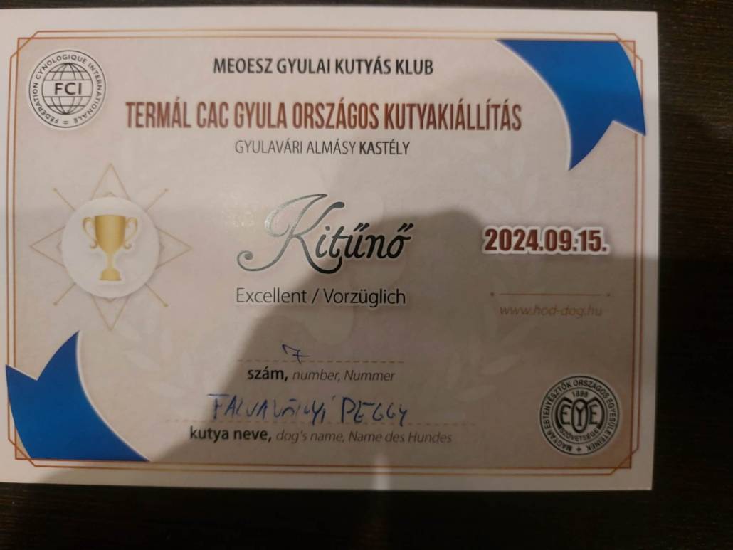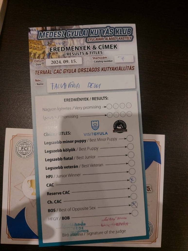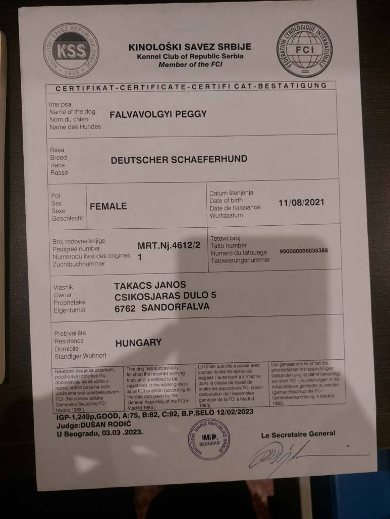 V (excellent) SG1 (top in the Jungen Klasse), Champion CAC BOS, IGP, BH, AD, Kor, HD1/ED1,